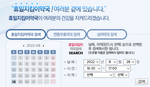 약국 외에도 병원도 일요일, 공휴일에 진료를 보는 곳이 많이 있습니다. 그럴 때도 당황하지 마시고 검색을 하시면 잘 안내되는 페이지가 있으니 참고하시면 되겠습니다.