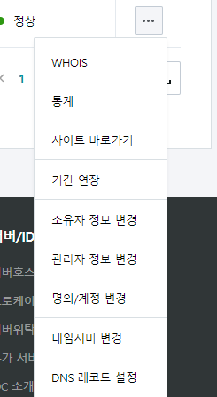 해당 도메인의 우측 끝에 있는 점3개 버튼을 누르면 소유자 정보 변경, 관리자 정보 변경 등의 메뉴가 보이죠. 그 중에 가장 아래에 있는 DNS 레코드 설정이 우리가 필요한 설정입니다.