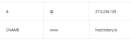 내주소.com으로 접속하면 티스토리 서버 주소인 27.0.236.139 로 연결이 되는 것입니다. CNAME은 www.내주소.com으로 로 접속해도 바로 연결되게 해 주는 것입니다.